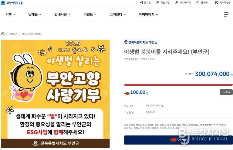 브릿지저널 윤나영 기자 | 부안군은 고향사랑기부제 지정기부 ESG 사업으로 추진한 ‘야생벌 붕붕이를 지켜주세요!’ 프로젝트가 기부자들의 꾸준한 참여 속에 목표 모금액 3억원을 달성했다고 밝혔다.