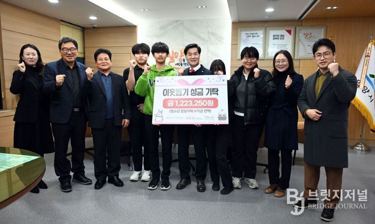 브릿지저널 김경미 기자 | 밀양시는 지난 22일 청소년문화의집 소속 청소년들이 시장실을 방문해 직접 운영한 일일카페 수익금 122만 3,250원을 연말 이웃돕기 성금으로 기부했다고 밝혔다.
