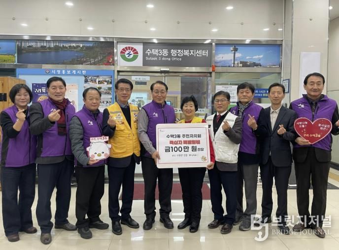 브릿지저널 김경미 기자 | 구리시 수택3동 주민자치회는 지난 12월 22일 지역 내 어려운 이웃을 지원하기 위해 적십자 특별회비 100만 원을 대한적십자사에 전달했다.