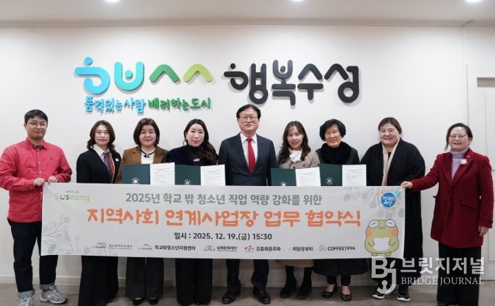 브릿지저널 김진석 기자 | 대구 수성구는 지난 19일 학교밖청소년의 직업 역량 강화를 위한 지역사회 연계사업 추진을 위해 관련 기관과 업무협약을 체결했다.