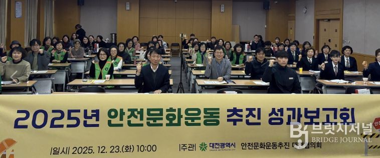 브릿지저널 정보영 기자 | 대전시는 23일 대전시청 세미나실에서 안전문화운동추진 대전협의회 소속 기관 및 단체 관계자 100여 명이 참석한 가운데 2025 안전문화운동 추진 성과보고회를 개최했다.