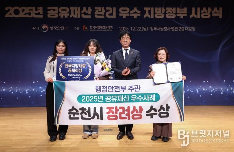 브릿지저널 김경미 기자 | 순천시는 지난 22일 행정안전부 주관으로 정부서울청사에서 열린 ‘2025년 공유재산 우수 지방단체 시상식’에서 공유재산 우수사례 경진대회 부분 ‘장려상’을 수상했다고 밝혔다.