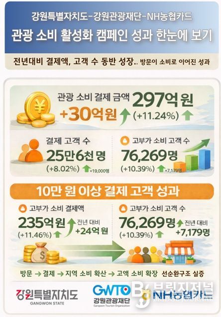 브릿지저널 윤나영 기자 | 강원특별자치도와 강원관광재단은 NH농협카드와 함께 추진한 ‘강원 관광소비 활성화 상생 캠페인’ 결과, 전년 동일 기간 대비 관광 소비 금액과 결제 고객 수가 모두 증가하며 실질적인 지역 소비 활성화 성과를 거둔 것으로 나타났다.