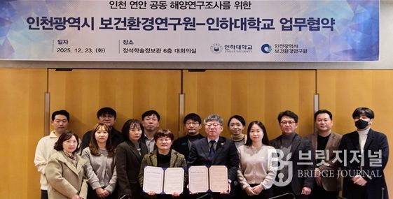 브릿지저널 김경미 기자 | 인천광역시 보건환경연구원은 인하대학교와 12월 23일 ‘인천해역 해양환경 공동조사 및 연구협력 업무협약(MOU)’을 체결했다고 밝혔다.