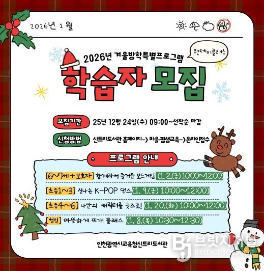 브릿지저널 김경미 기자 | 인천광역시교육청신트리도서관은 겨울방학을 맞아 유·아동부터 성인까지 참여할 수 있는 ‘겨울방학 특별프로그램’을 운영한다.
