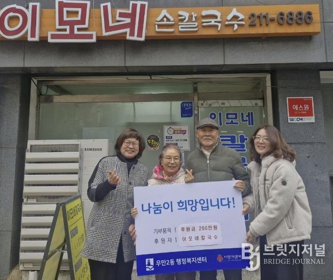 브릿지저널 김경미 기자 | 수원시 팔달구 우만2동은 지난 23일, 이모네칼국수와 함께 이웃나눔 후원금 전달식을 진행했다고 밝혔다.