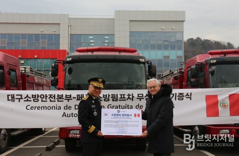브릿지저널 김진석 기자 | 대구소방안전본부는 12월 23일 오후 2시, 소방교육훈련센터에서 소방차량 무상양여 기증식을 가지고, 페루에 소방차량 3대를 양여했다.