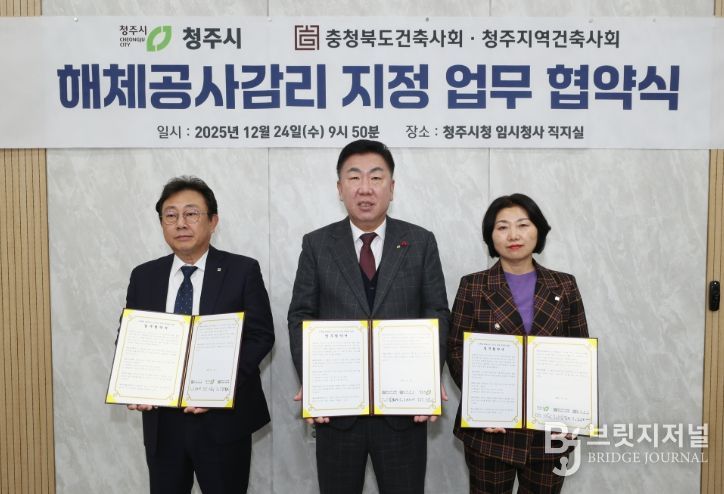 브릿지저널 김경미 기자 | 청주시는 24일 대한건축사협회 충청북도건축사회, 청주지역건축사회와 ‘건축물 해체공사 감리자 지정 업무대행에 관한 업무협약(MOU)’을 체결한다.