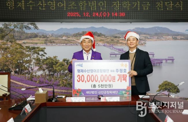 브릿지저널 김경미 기자 | 형제수산영어조합법인(대표 주정호)이 24일 신안군장학재단(이사장 김대인)에 어려운 환경속에서도 학업에 정진하는 학생들을 위해 장학기금 3천만 원을 기탁했다. 이번 기탁으로 형제수산영업조합법인은 2022년, 2023년에 2천만 원을 기탁한 데 이어, 누적 장학기금을 5천만 원을 전달하게 됐다.