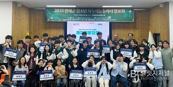 브릿지저널 윤나영 기자 | 인제군이 주최하고 UN지속가능발전교육 인제전문센터가 주관한 ‘2025 인제군 청소년 지속가능발전 동아리 발표회’가 지난 22일 인제군 지역공동체사업센터에서 열렸다.