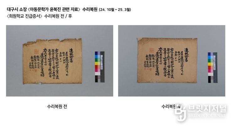 대구시(문화유산과) 소장 〈아동문학가 윤복진 관련 자료〉는 가요곡집과 졸업앨범 등 지역을 대표한 작가의 활동과 우리나라 동요사를 재조명하는 자료로 중요성을 인정받는 문화유산이었지만, 근대기 제작된 종이 수급이 어려워 수리복원에 많은 난항을 겪었다. 이에 대구간송미술관 수리복원팀은 자료와 유사한 종이를 직접 제작하여 결손부 보완 및 낙장 부분에 적용했고, 주변부와 유사한 색으로 색맞춤했다. 수리복원이 완료된 자료들은 지난 5월 대구예술발전소에서 개최된 전시 ‘수리복원, 기억을 잇다’를 통해 소개되며, 지역 출신 아동문학가 윤복진을 재조명하는 계기를 마련했다.