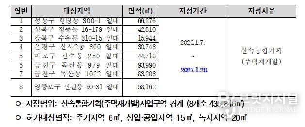브릿지저널 김경미 기자 | 서울시는 신속통합기획 주택재개발 후보지로 선정된 8개 구역(총0.44㎢)을 신규 토지거래허가구역으로 지정하여 투기성 토지거래를 원천 차단하고 정비사업의 투명성을 강화한다.