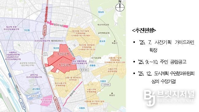 브릿지저널 김경미 기자 | 서울시는 2025년 12월 24일 '제14차 도시계획위원회 신속통합기획 정비사업 등 수권분과위원회'를 개최하여 ‘독산동 1036일대(독산1구역)’과 ‘독산동 1072 일대(독산2구역)’ 주택정비형 재개발사업 정비구역 지정 및 정비계획 결정(안)을 '수정가결' 했다고 밝혔다.