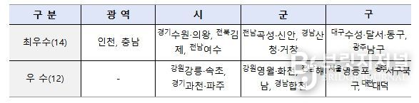 종합점수 산정결과, 인천, 충남 등 광역 지자체 2곳, 경기 수원, 전남 곡성, 대구 수성 등 기초 지자체 24곳 등 총 26곳이 우수 지방정부로 선정됐다.