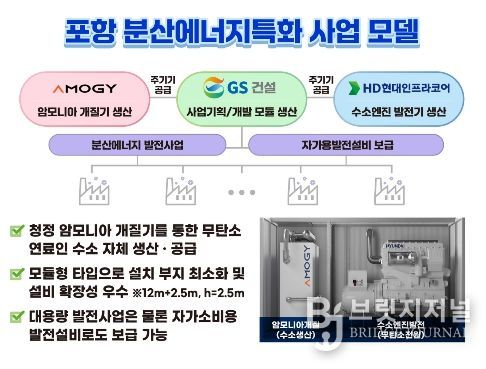 경북 포항 분산에너지 특화지역은 무탄소에너지 공급시스템 실증사업 모델이다. 포항시 흥해읍 일원의 영일만 산업단지(4,440천㎡)를 중심으로 그린 암모니아 기반의 수소엔진발전 실증을 통해 무탄소 분산전원을 상용화하여 청정전력을 지역 수요기업에 직접 공급한다는 계획이다. 분산사업자는 ㈜GS건설과 ㈜아모지, ㈜HD현대인프라코어가 컨소시엄을 구성하여 추진된다.