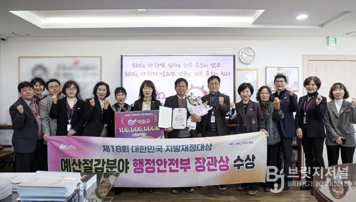 브릿지저널 김경미 기자 | 마포구는 12월 17일, 행정안전부가 주관한 ‘제18회 대한민국 지방재정대상’에서 예산절감 분야 행정안전부 장관상을 수상하고 인센티브로 특별교부세 1억 원을 확보했다.