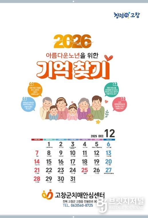 브릿지저널 윤나영 기자 | 고창군 치매안심센터가 치매에 대한 올바른 인식 개선과 예방 실천을 돕기 위해 ‘2026년 건강달력’을 제작해 지역 주민에게 배부한다고 밝혔다.