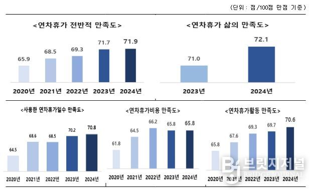 연차 소진율은 79.4%로 전년 대비 1.6%포인트 증가해 근로자 휴가조사를 시작한 2018년 이래 최고치를 나타냈다. 연차 사용 목적으로는 여행이 35%로 2022년 이후 가장 높은 비율을 유지하고 있으며, 그다음으로 휴식 28.6%, 집안일 16.0% 등의 순으로 나타났다.