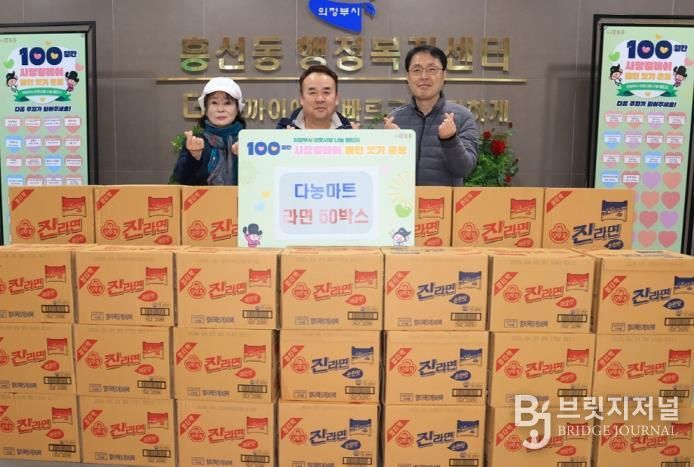 브릿지저널 김경미 기자 | 의정부시 흥선동행정복지센터는 12월 24일 다농마트가 ‘100일간 사랑릴레이 배턴 잇기’에 동참해 라면 50상자를 기탁했다고 밝혔다.