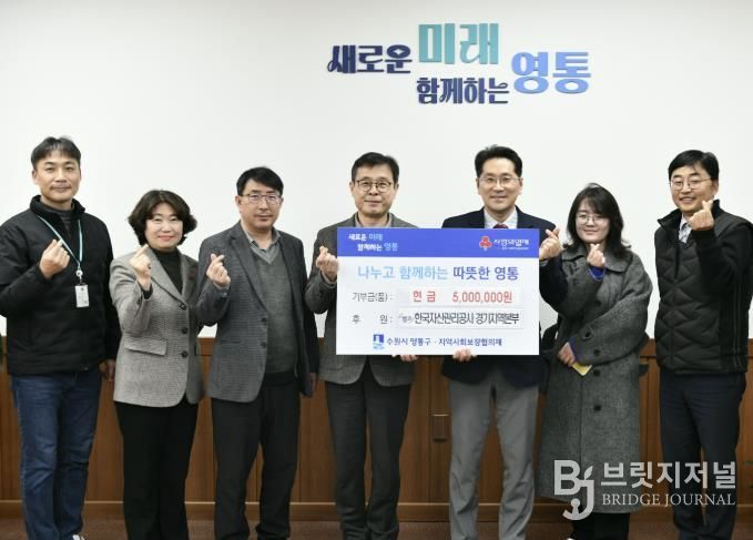 브릿지저널 김경미 기자 | 수원시 영통구는 지난 24일 한국자산관리공사 경기지역본부에서 관내 경제적으로 어려움을 겪는 이웃을 위해 성금 500만 원을 기부했다고 밝혔다.