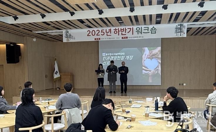 브릿지저널 김경미 기자 | 동두천시 시설관리공단은 지난 22일 동두천 자연휴양림 세미나실에서 열린 2025년 하반기 워크숍에서 인권경영 헌장 개정 및 선포식을 개최했다고 밝혔다.
