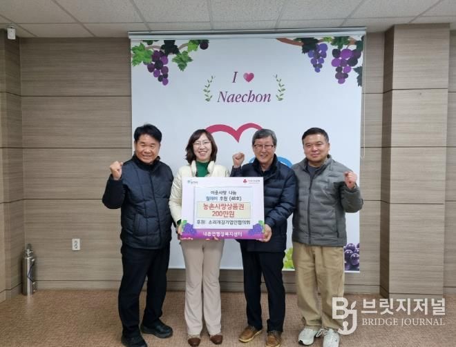 브릿지저널 김경미 기자 | 포천시 내촌면 행정복지센터는 지난 24일 소리개길기업인협의회가 농촌사랑상품권 200만 원 상당을 경기 사회복지공동모금회에 기탁하며 ‘이웃사랑 나눔 릴레이 48호’에 동참했다고 밝혔다.