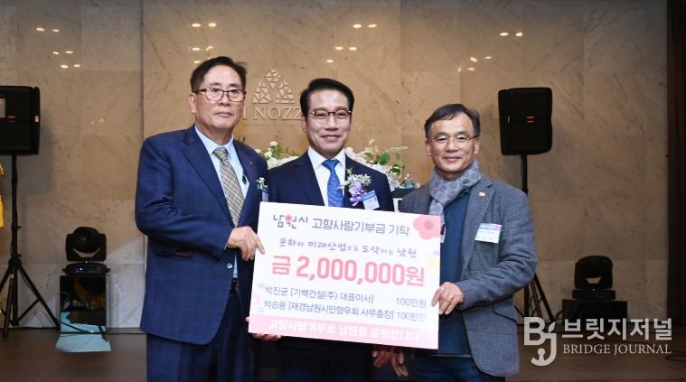 브릿지저널 윤나영 기자 | 지난 24일, 성동구에서 열린 재경남원시민향우회 제61주년 종기총회 및 회장 이취임식에서 박승용 사무총장과 박진균 향우회원(기백건설(주) 대표이사)이 남원시 고향사랑기부금 각 100만원씩을 기탁했다.