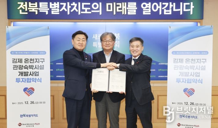 브릿지저널 윤나영 기자 | 전북특별자치도가 26일 도청 회의실에서 김제시, 베스트웨스턴플러스 김제호텔과 김제 온천지구 관광숙박시설 개발사업 투자협약(MOU)을 체결했다.