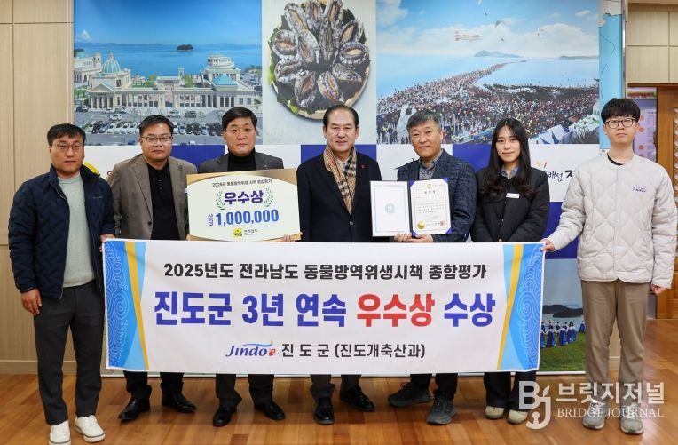 브릿지저널 김경미 기자 | 진도군은 전라남도에서 주관한 ‘2025년 동물방역위생시책 종합평가’에서 우수상을 받으며, 3년 연속 우수 지방자치단체로 선정됐다.