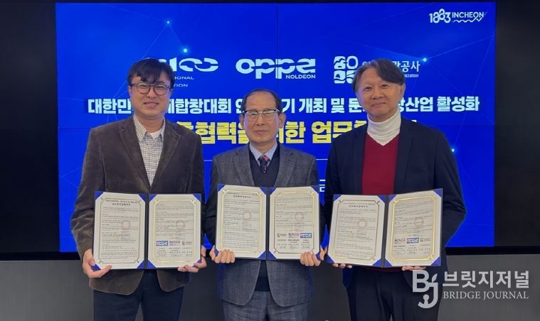 브릿지저널 김경미 기자 | 인천관광공사(사장 유지상)와 대한민국국제합창대회 조직위원회(위원장 김희철), ㈜놀던오빠들(대표 김준호)은 26일 인천관광공사에서 ‘대한민국국제합창대회 인천 개최(2026년~2030년) 및 문화관광 활성화’를 위한 업무협약을 체결했다.