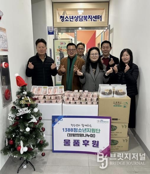 브릿지저널 김경미 기자 | 양평군청소년상담복지센터는 지난 24일 1388청소년지원단으로부터 위기청소년을 위한 후원물품을 전달받았다고 밝혔다. 이날 전달식에는 임청우 단장과 양평 목우촌 문현길 대표가 참석해 돼지고기와 둥굴레차 세트 70개를 양평군청소년상담복지센터와 양평군학교밖청소년지원센터에 기부했다.