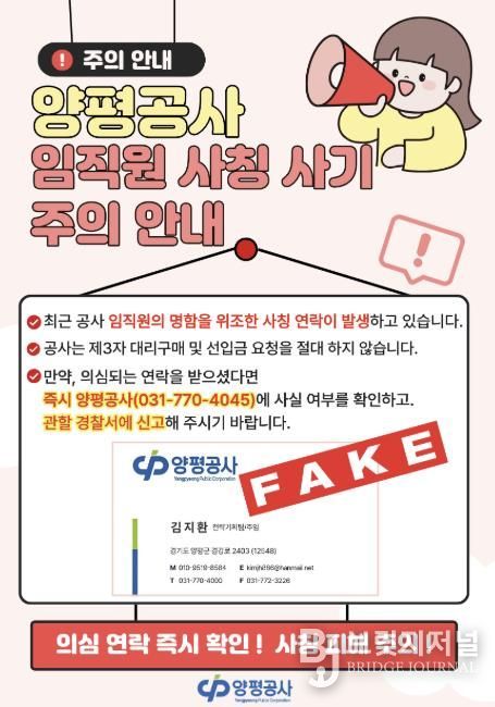 브릿지저널 김경미 기자 | 양평공사는 최근 공사 직원을 사칭한 보이스피싱 사례가 잇따르자, 소상공인 및 지역 업체의 피해를 예방하기 위해 ‘보이스피싱 예방 대응 매뉴얼’을 제작·배포한다고 24일 밝혔다.
