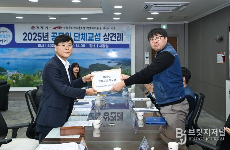 브릿지저널 김경미 기자 | 거제시는 26일 시장실에서 전국공무원노동조합 경남지역본부 거제시지부(지부장 유해길)와 2025년 단체교섭을 위한 상견례를 가졌다고 밝혔다.