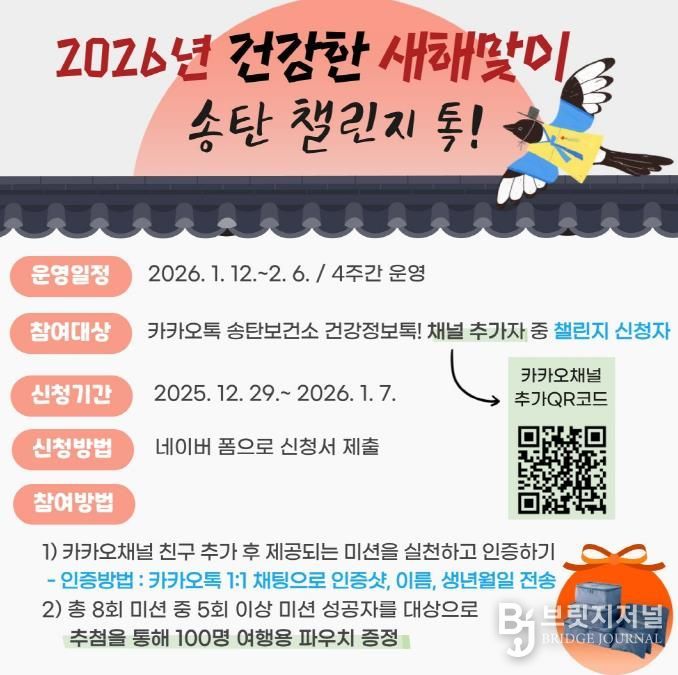 브릿지저널 김경미 기자 | 평택시 송탄보건소는 12월 29일부터 2026년 1월 7일까지 건강한 새해맞이 ‘송탄 챌린지 톡!’1차 참여자를 모집한다고 밝혔다.