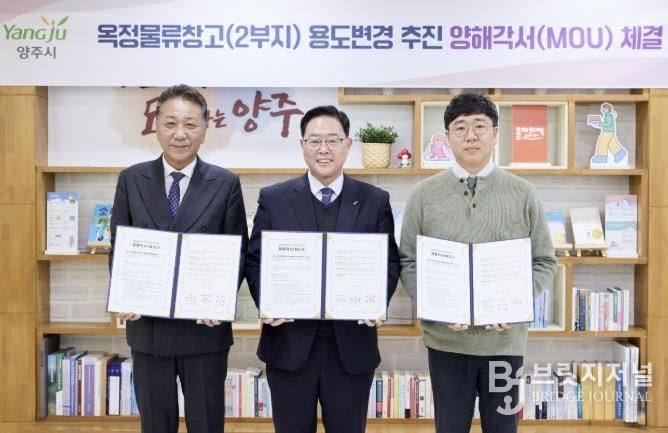 브릿지저널 김경미 기자 | 양주시가 26일 시청 시장실에서 옥정물류창고 2부지 사업 취소와 용도변경 추진을 위한 양해각서를 체결했다.