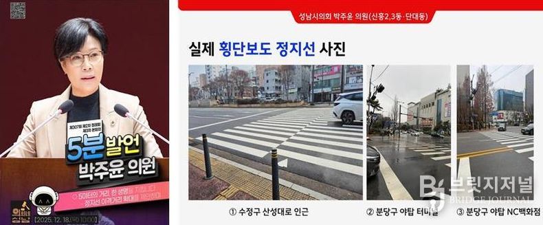 브릿지저널 김경미 기자 | 성남시의회 박주윤 의원(국민의힘, 신흥2·3동·단대동)은 12월 18일 열린 제307회 성남시의회 제3차 본회의 5분 발언에서 보행자의 생명과 직결된 ‘횡단보도 정지선 이격거리 확대 설치’의 시급성을 강조하며, 성남시의 적극적인 개선책 마련을 촉구했다.