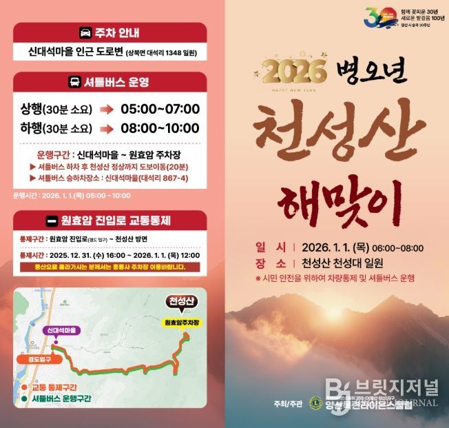 브릿지저널 김경미 기자 | 양산시는 올해로 3번째를 맞는 양산 천성산 해맞이 행사가 양산목련라이온스클럽(국제라이온스협회 355-D 양산지구 제3지역 소속)의 주최·주관으로 2026년 1월 1일 천성산 천성대 일원에서 개최된다고 밝혔다.