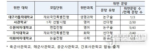 대구가톨릭대학교는 생명과학 1문항, 사관학교는 영어 2문항, 수원여자대학교는 영어 5문항, 우석대학교는 화학 2문항, 이화여자대학교는 수학 1문항이 고등학교 교육과정 범위를 위반한 것으로 나타났다. 위반 문항 비율은 대학별고사를 시행한 전체 대학의 문항 중 0.3%였다.
