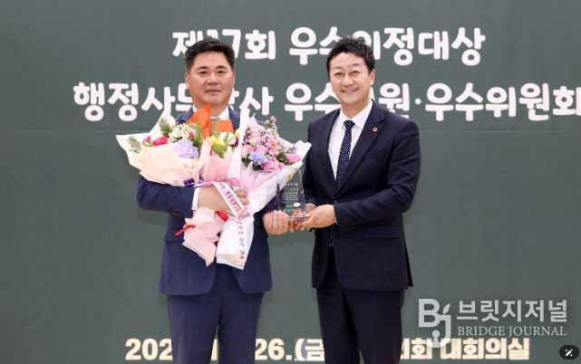 브릿지저널 김경미 기자 | 경기도의회 경제노동위원회 정하용 의원(국민의힘, 용인5)이 26일 열린 2025년 경기도의회 의원 종무식 및 시상식에서 대한민국시도의회의장협의회가 주관하는 ‘제17회 우수의정대상’ 및 경기도의회가 주관하는 ‘2025년 행정사무감사 우수의원’을 동시에 수상하는 영예를 안았다.