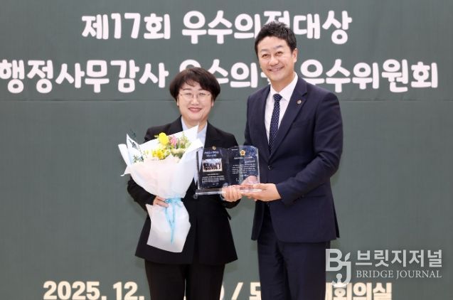 브릿지저널 김경미 기자 | 경기도의회 경제노동위원회 고은정 위원장(더불어민주당, 고양10)은 26일 경기도의회에서 열린 ‘2025년 경기도의회 시상식’에서 대한민국시도의회의장협의회가 주관하는 ‘제17회 우수의정대상’을 수상했다.