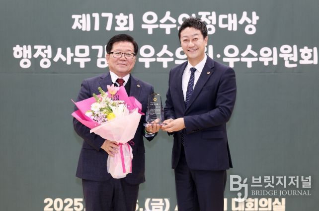 브릿지저널 김경미 기자 | 경기도의회 건설교통위원회 허원 위원장(국민의힘, 이천2)은 26일 경기도의회 대회의실에서 열린 ‘2025년 경기도의회 시상식’에서 대한민국시도의회의장협의회가 수여하는 ‘제17회 우수의정대상’을 수상했다.