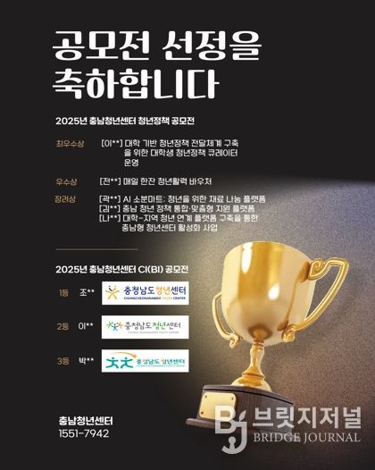 브릿지저널 정보영 기자 | 충청남도는 도정에 반영 가능한 우수 청년정책을 발굴하기 위해 추진한 '2025년 충청남도 청년정책 공모전' 심사를 마무리하고, 총 5건의 수상작을 선정했다고 밝혔다.