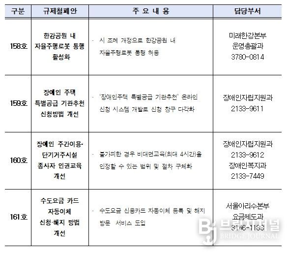 서울시는 내년 상반기 중으로 ▴한강공원 자율주행로봇 통행 허용(158호) ▴장애인주택 특별공급 기관추천 신청방법 개선(159호) ▴장애인시설 종사자 인권교육 개선(160호) ▴수도요금 카드 자동이체 개선(161호), 총 4건의 규제를 개선하겠다고 밝혔다.