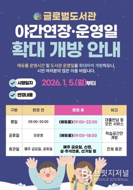 브릿지저널 김경미 기자 | 의왕시 글로벌도서관(보식골로 30-10)이 시민들의 학습 편의 증진과 도서관 이용 활성화를 위해 2026년 1월 5일부터 도서관 이용 시간 야간 연장 및 공휴일 확대 운영을 실시한다.