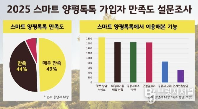 브릿지저널 김경미 기자 | 양평군은 지난 8일부터 17일까지 10일간 ‘스마트 양평톡톡’ 이용자를 대상으로 만족도 설문조사를 실시해 4,607명의 의견을 수렴한 결과, 응답자의 93% 이상이 서비스에 만족하는 것으로 나타났다고 밝혔다.