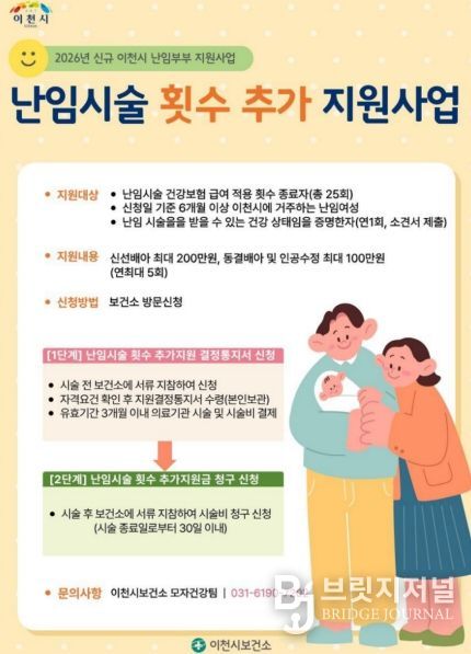 브릿지저널 김경미 기자 | 이천시는 난임시술 건강보험 지원 횟수를 모두 소진한 난임 부부에게 심리적·경제적 부담을 완화하고 출산 친화적 환경을 조성하고자 2026년 ‘난임시술 횟수 추가 지원사업’을 새롭게 추진한다.