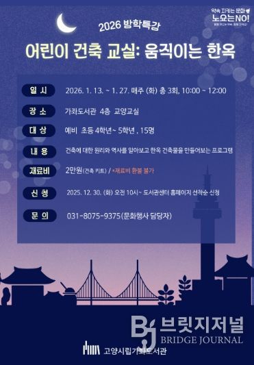 브릿지저널 김경미 기자 | 고양특례시 가좌도서관은 2026년 1월 13일부터 27일까지 매주 화요일 3회차에 걸쳐 방학특강 프로그램 ‘어린이 건축 교실: 움직이는 한옥’을 운영한다고 밝혔다.