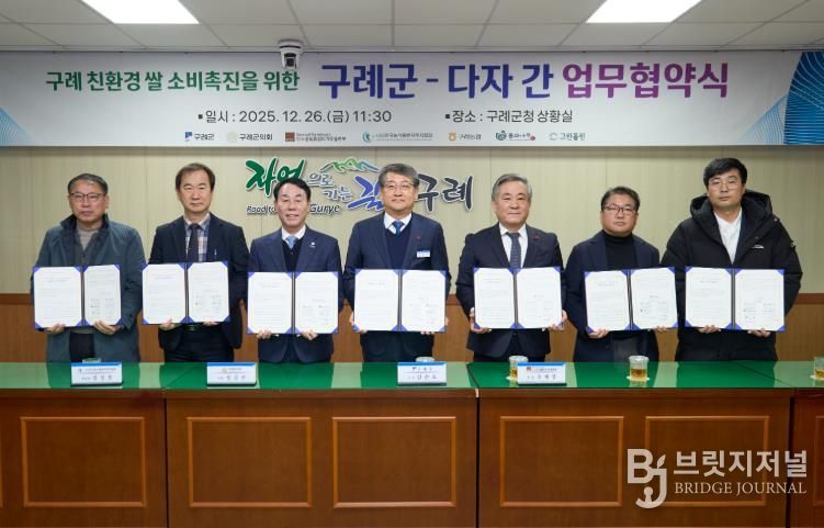 브릿지저널 김경미 기자 | 구례군은 친환경 농업의 가치를 확산하고 쌀 소비 기반을 강화하기 위해 공공·금융·농협·민간이 참여하는 다자간 업무협약을 지난 12월 26일 군청 상황실에서 체결했다.