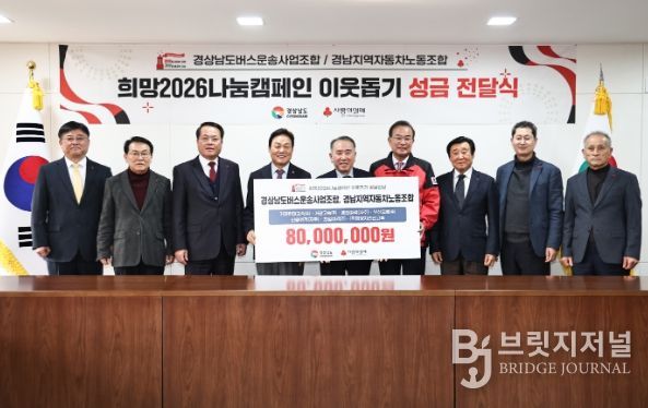 브릿지저널 김경미 기자 | 경상남도는 29일 도청 소회의실에서 경남버스운송사업조합(이사장 양기환)과 경남지역자동차노동조합(위원장 박지훈)이 도내 취약계층을 돕기 위한 성금 8천만 원을 전달했다고 밝혔다.