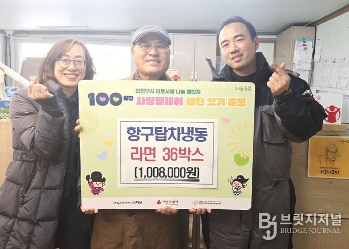 브릿지저널 김경미 기자 | 의정부시 장암동주민센터는 12월 29일 항구탑차냉동이 라면 36상자(100만 원 상당)를 기부하며 ‘100일간 사랑릴레이 배턴 잇기’에 동참했다고 밝혔다.